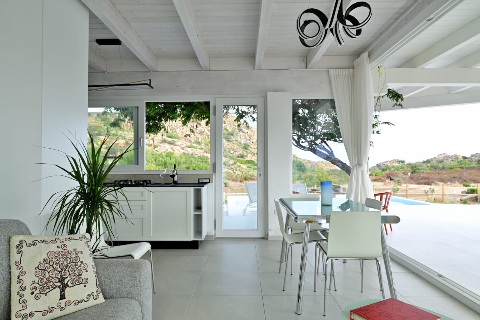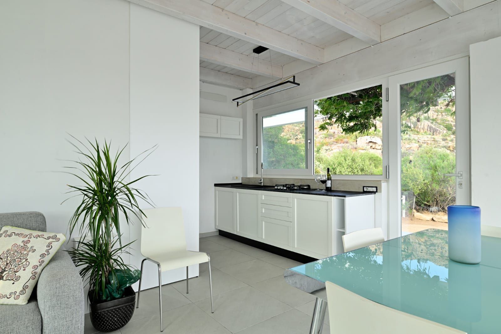 E' dotata di cucina-soggiorno abitabile con vista sulla piscina, sul parco privato e vista mare, di una camera, di un bagno e lavanderia. Una ampia a splendida veranda, ben arredata di salotti e due zone pranzo per mangiare all'aperto, ruota attorno ai due lati della cucina-soggiorno aprendosi sul giardino e sulla zona prendisole della piscina. Un glicine davanti alla cucina, nella veranda, ombreggia e aggiunge una nota romantica ed esclusiva ad un paesaggio intorno selvaggio e potente, dato dai graniti della montagna della tenuta e dalla spontanea macchia mediterranea. Due cavalli pascolano liberi nel parco esterno circostante il giardino della villa.